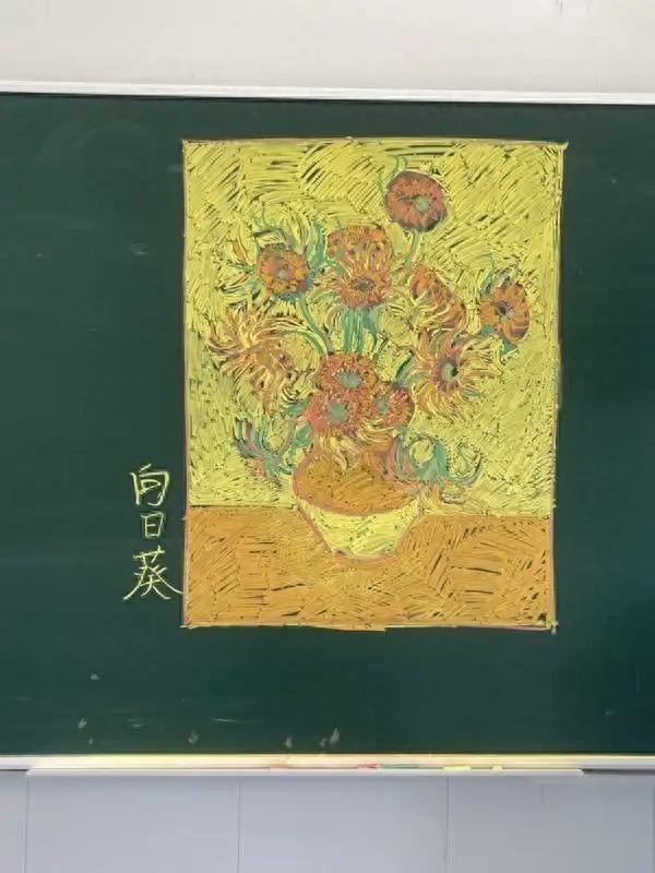“今天美术张老师画在黑板上的画,孩子们舍不得擦,我把它拍下来,大家一起欣赏张老师的风采。”近日,杭州市天长小学六(2)班班主任董老师在家长群里发了一张黑板画,瞬间引爆了家长群:画中用粉笔创作的梵高《向日葵》栩栩如生,花瓣如火焰般跳动,茎杆挺拔有力,引得家长们纷纷赞叹“太厉害了”“又要圈粉无数个小朋友了。”