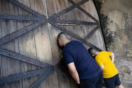 客在圣克里斯托瓦尔城堡外透过大门窥视 来源:新华社