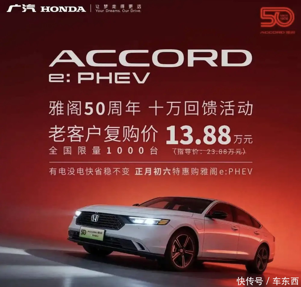 广汽本田日前宣布,为庆祝雅阁50周年,老客户复购雅阁e:PHEV车型,仅需13.88万元,较官方指导价直降10万元,58折卖车,创下上市后最高降价纪录,限量1000辆。