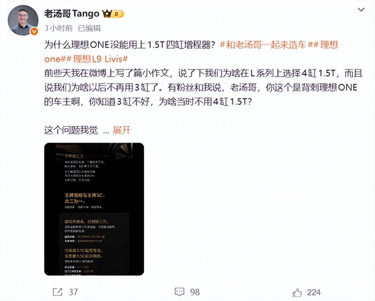 2月27日,理想汽车产品线负责人“@老汤哥”通过社交平台发文,首次详细解释了理想ONE车型当年未采用1.5T四缸增程器的原因,揭开了这款曾经热门车型背后的技术选择困境。