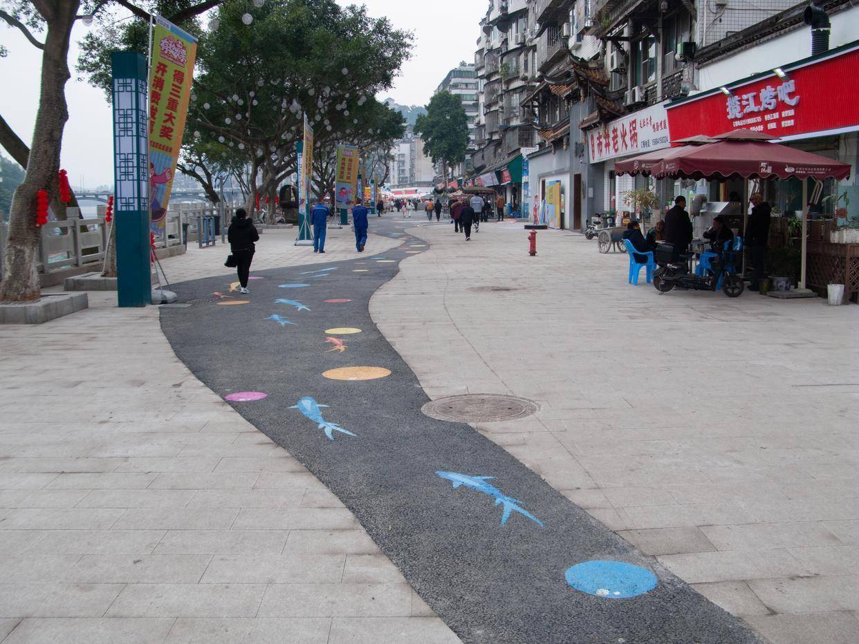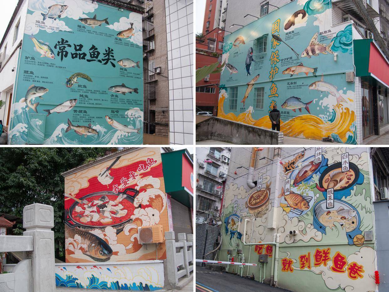 沥青路面代表着永宁河在每一个可以进出的路口,当头的房子墙面都是精心设计的彩绘:有的是国家保护鱼类和常品鱼类的图鉴科普,有的是各种吃鱼的吃法,有的是关于永宁河的神奇传说……