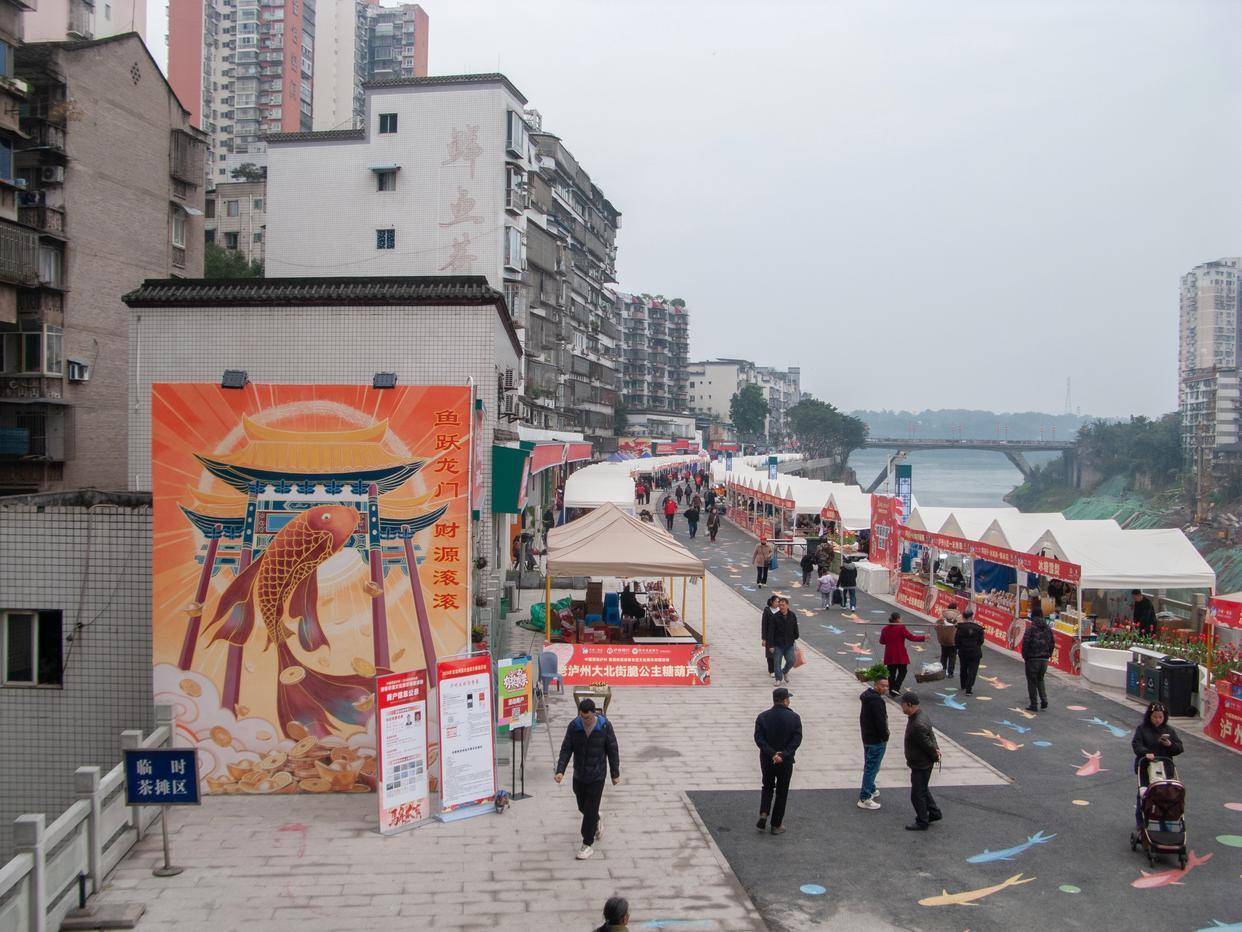 在街上可以看鲜鱼巷全景临近除夕,鲜鱼巷的展销会一大早就很热闹。站在入口处俯瞰,整整齐齐的白色尖顶帐篷市集、红红火火的春节氛围、深灰色路面上游弋的彩色小鱼……还没走进鲜鱼巷,这个“鲜”就已经扑面而来。
