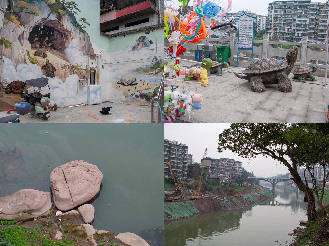 在距长江入口五百米的西岸河边,有一块状如乌龟的巨石,叫“乌龟石”。枯水季节,“乌龟”盘踞河边,这里也是永宁河180滩的最后一滩。自然,这个景致也被鲜鱼巷重现。